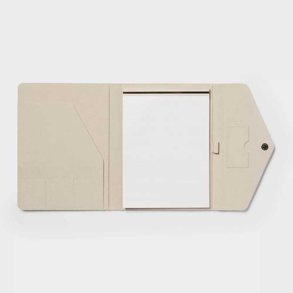 Designed in a beige hue, this envelope-shaped padfolio features 160 college-ruled lined pages in white to jot down notes, agendas and other reminders. Boasting a hardcover with a snap closure, this padfolio comes with a pen holder and multiple inner sleeves to keep business cards, IDs and more.